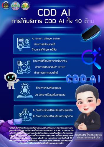 อีกทั้ง CDD Al Chatbot : ผู้ช่วยอัจฉริยะตอบทุกเรื่องงานพัฒนาชุมชน ถูกออกแบบมาเพื่อยกระดับการให้บริการของกรมการพัฒนาชุมชน สู่ยุค Digital Government อย่างแท้จริง ด้วยเทคโนโลยีปัญญาประดิษฐ์ (AI) ที่พัฒนาขึ้นโดยกรมการพัฒนาชุมชน Chatbot ที่พร้อมให้คำตอบและคำแนะนำในหลากหลายด้าน โดยเน้นการสื่อสารเป็นภาษาไทย เข้าใจจ่าย และเข้าใจบริบทของงานพัฒนาชุมชนอย่างลึกซึ้ง
